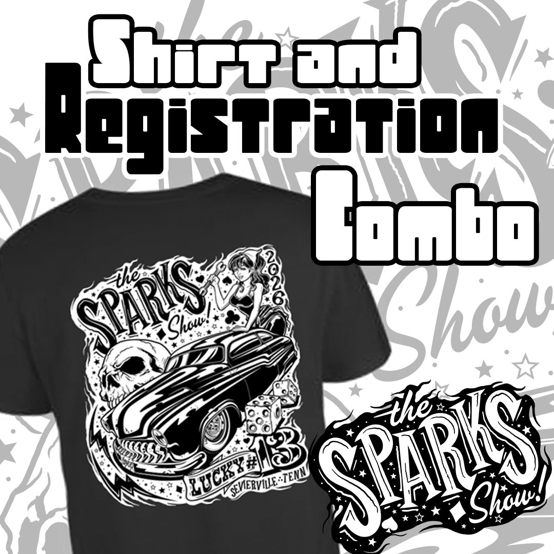 This 13th Anniversary design for The Sparks Show brings bold black-and-white kustom energy to Sevierville. A sleek classic coupe leads the charge, surrounded by dice, cards, a skull, and a wrench-wielding pin-up — all wrapped in gritty, tattoo-flash style.