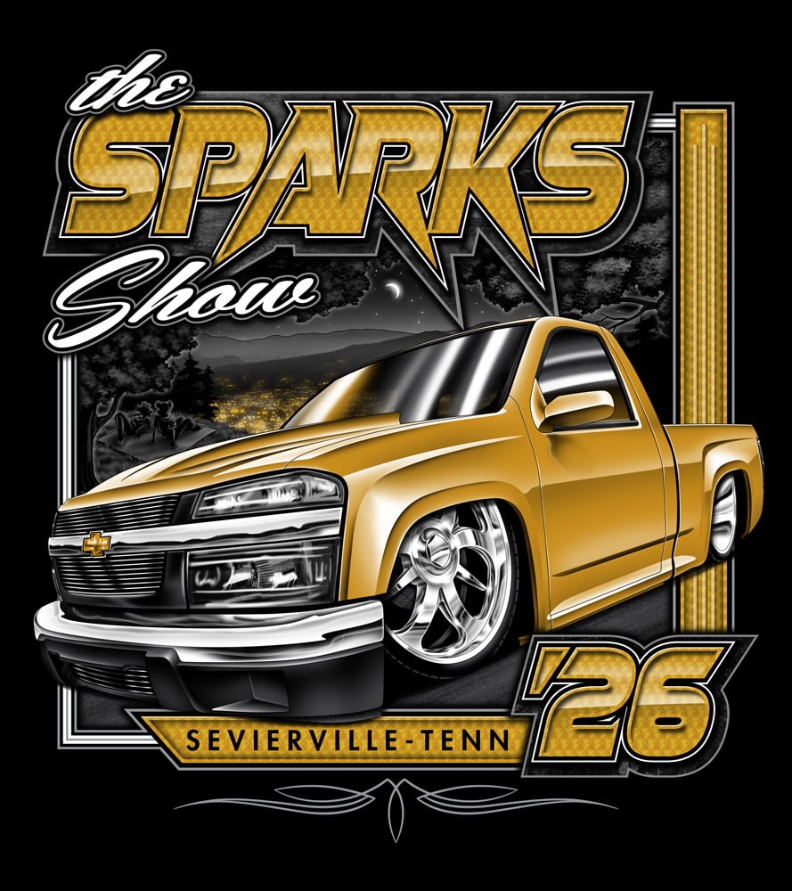 For The Sparks Show, this anniversary design features Kevin Stroub’s Colorado laid out in gold against the glowing backdrop of Gatlinburg and the Great Smoky Mountains. Mountain lights, bagged w/ big billets, and pure mini-truck legacy.